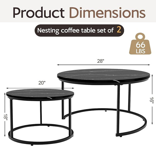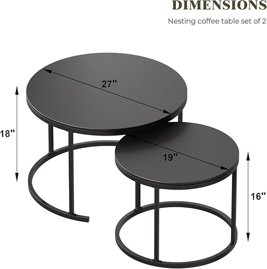 Round Nesting Coffee Table, Black Modern Decorative Coffee Center Table Set of 2, Sintered Stone Coffee Table for Living Room with Sturdy Metal Frame.