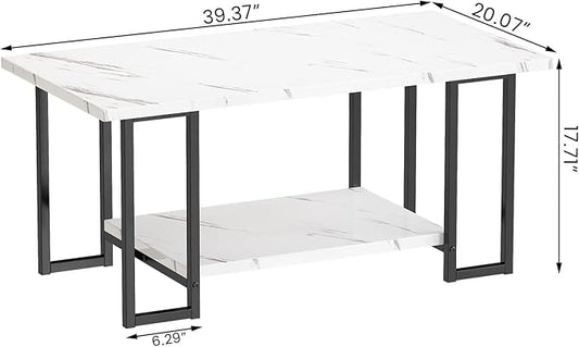Lamerge Coffee Table, Modern Faux Marble Top Coffee Table with Metal Frame and Storage Shelf, 2-Tier Rectangle Accent Cocktail Table for Living Room, Office (White)