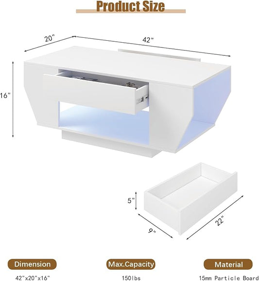 42" White Modern Coffee Table for Living Room, High Glossy Wooden Living Room Table with Storage, Led Rectangular Coffee Tables with 2 Drawers, Wood Center Table for Reception Dinning Room