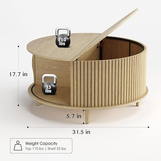 Round Coffee Table with Storage,Fluted Lift Up Coffee Table with Sliding Door,31.5" Drum Center Table with Bun Feet for Living Room,Home Small Space,Oak