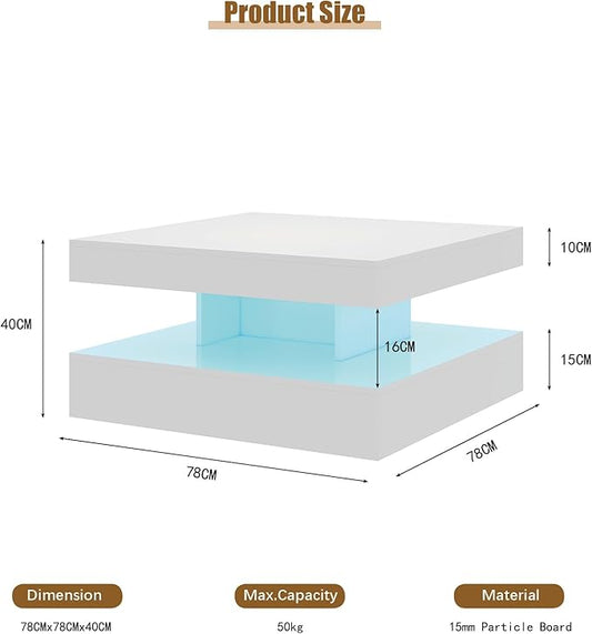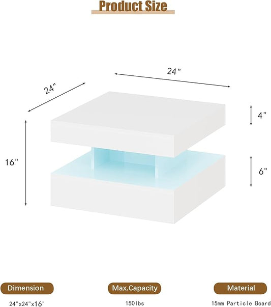 White LED Coffee Table for Living Room, Living Room Table 2-Tier Square Middle Center Table, Modern Coffee Tables with Storage, Wood Tea Tables for Dining Reception, Skin Feeling
