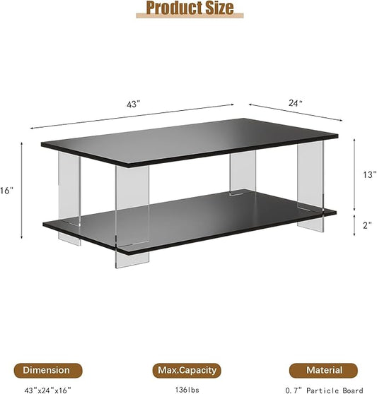 43" Acrylic Coffee Table with Black Wood Top, Minimalist Stylish Modern Rectangular Center Tables for Living Room, Led Living Room Table with Storage Shelf & Acrylic Frame for Small Space