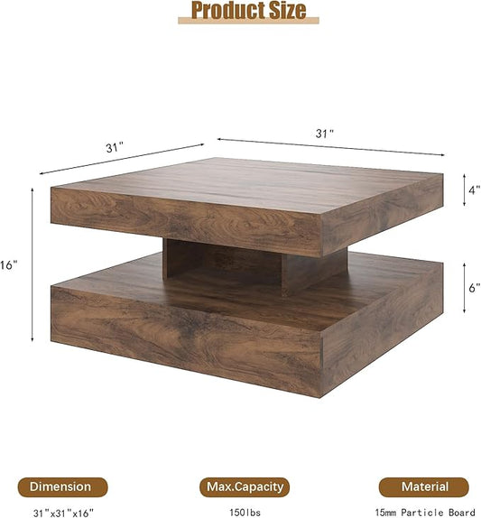 LED Coffee Table for Living Room, Living Room Table 2-Tier Square Middle Center Table, Modern Coffee Tables with Storage, Contemporary Wood Tea Tables for Dining Reception, Rustic
