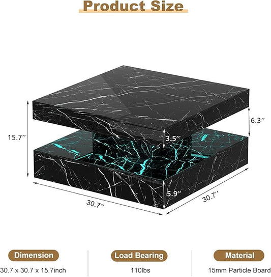Black Marble LED Coffee Table for Living Room, Living Room Table 2-Tier Square Middle Center Table, Modern Coffee Tables with Storage, Contemporary Wood Tea Tables for Dining Reception