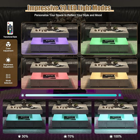 Grey LED Coffee Table for Living Room, Living Room Table 2-Tier Square Middle Center Table, Modern Coffee Tables with Storage, Contemporary Wood Tea Tables for Dining Reception