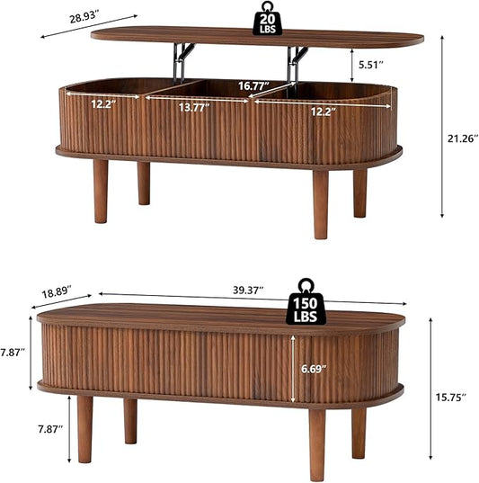Fluted Lift Top Coffee Table with Hidden Compartment, Fully Assembled Wooden Center Table, Modern Oval Lift Tabletop for Home Living Room Office, Walnut