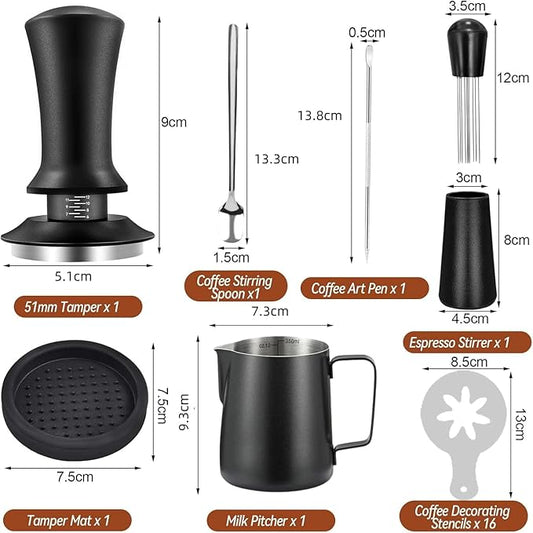 51 mm Coffee Tamper Set Coffee Press for Portafilter Machine Espresso Tamper with Tamper Mat, Frothing Pitcher (350ml/11.836oz), Barista Towel, Latte Art Pen and Decorative Stencils