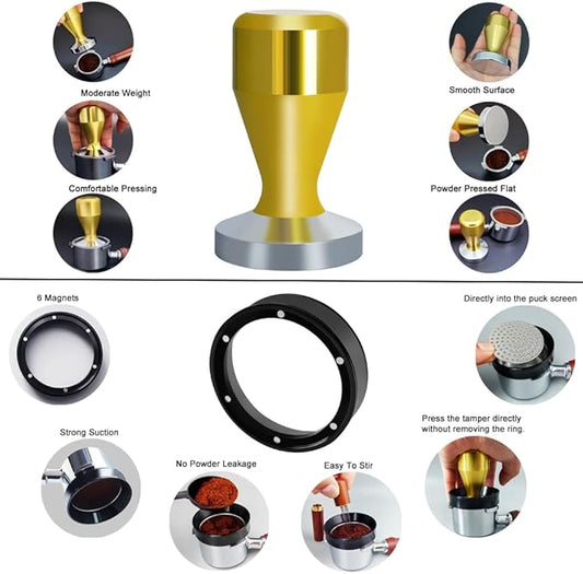 51mm Espresso Tamper Set, 5PCS Coffee Tamper Kit with WDT Tool, Coffee Stirrer, Dosing Funnel, Puck Screen 51mm Espresso Accessories Tampers Kit (Gold)