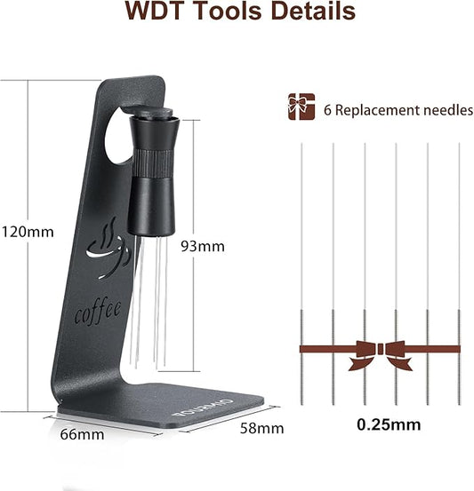 WDT Tool - Coffee Distribution Tool with Magnetic Stand, Adjustable Range Espresso Stirrer, 304 Stainless Steel 6 Needles 0.4mm and 6 Extra Needles 0.25mm