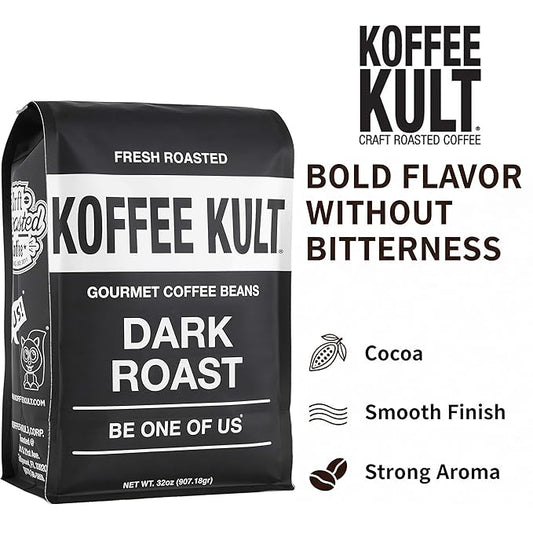 Koffee Kult Dark Roast Whole Bean Coffee - Small Batch 100% Arabica Gourmet Blend, Smooth and Well Balanced Artisan Roasted in 32oz Resealable Package
