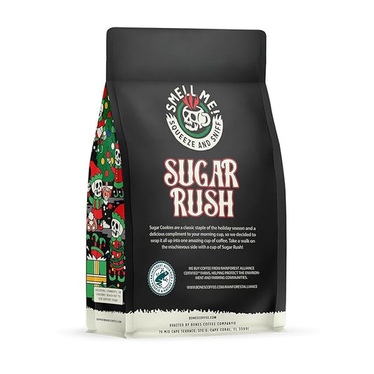 Bones Coffee Company Sugar Rush, Sugar Cookies Flavored Coffee, Medium Roast Low Acid Arabica Beans Compatible with Auto drip and French Press Coffee Maker, 12 Oz Whole Bean