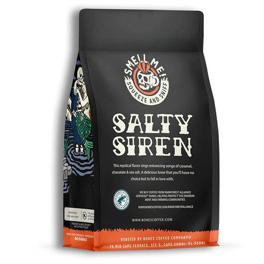 Bones Coffee Company Salty Siren, Sea Saled Caramel Chocolate Flavored Coffee, Medium Roast Low Acid Arabica Beans Compatible with Auto drip and French Press Coffee Maker, 12 Oz Whole Bean