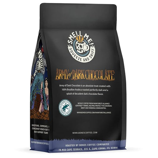 Bones Coffee Company Army of the Dark Chocolate Flavored Coffee, Medium Roast Low Acid Arabica Beans Compatible with Auto drip and French Press Coffee Maker, 12 Oz Whole Bean