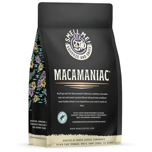 Bones Coffee Company Macamaniac, Macadamia and Coconut Flavored Coffee, Medium Roast Low Acid Arabica Beans Compatible with Auto drip and French Press Coffee Maker, 12 Oz Whole Bean
