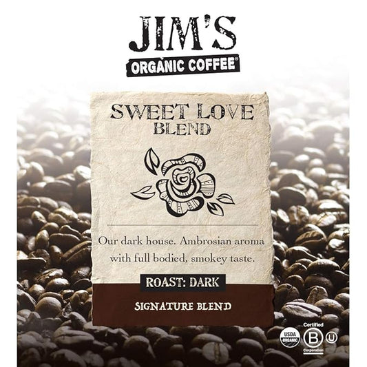 Jim’s Organic Coffee – Sweet Love Blend – Whole Bean, Dark Roast, Bold 11 oz Bag
