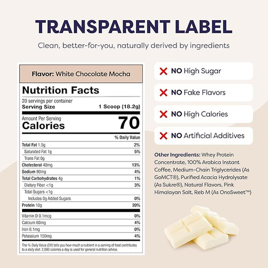 White Chocolate Mocha Protein Iced Coffee - Premium Whey Protein & Instant Iced Coffees - 100% Natural Cold Brew Coffee - Zero Artificial Flavors & Sweeteners, 80 mg Caffeine, 0g of Sugar, 20 Servings