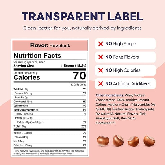 Hazelnut Protein Iced Coffee - Premium Whey Protein & Instant Iced Coffees - 100% Natural Cold Brew - Zero Artificial Flavors & Sweeteners, 80 mg Caffeine Per Serving, No Added Sugar, 20 Servings