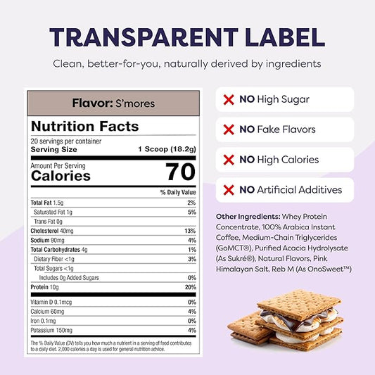 Javvy S’Mores Protein Iced Coffee - Premium Whey Protein & Instant Iced Coffees - 100% Natural Cold Brew - Zero Artificial Flavors & Sweeteners, 80 mg Caffeine, No Added Sugar, 20 Servings