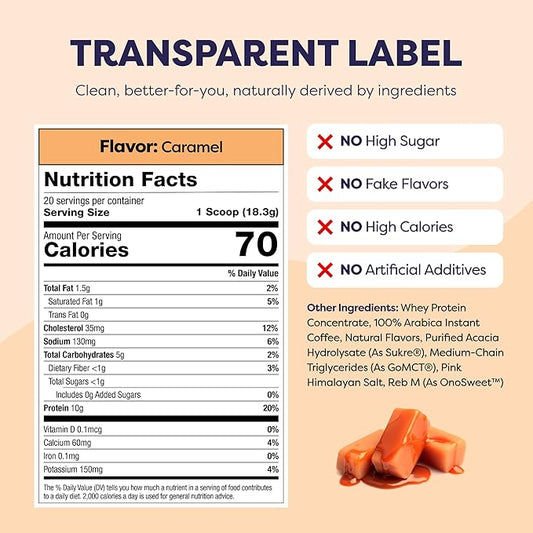 Caramel Protein Iced Coffee - Premium Whey Protein & Instant Iced Coffees - 100% Natural Cold Brew - Zero Artificial Flavors & Sweeteners, 80 mg Caffeine Per Serving, No Added Sugar, 20 Servings