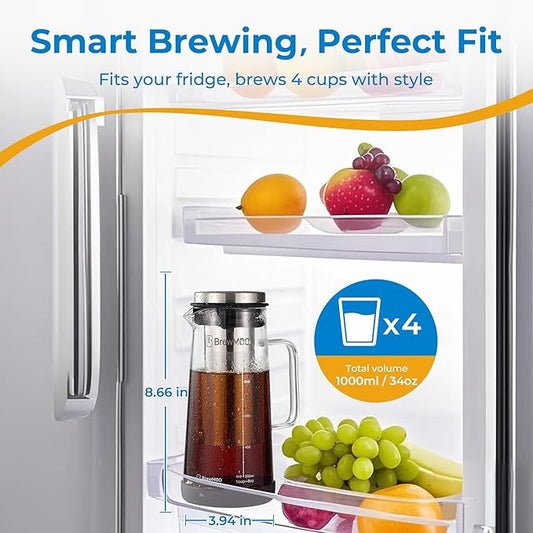 BrewMOO- Airtight Cold Brew Coffee Maker Pitcher, 1.0L/34Oz Thick Glass Carafe with Filter, Comfort Sturdy Handle & Wide Spout, Non-Slip Base | Iced Tea Maker (Grey)