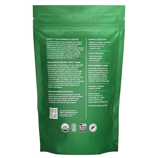 Purity Coffee EASE Dark Roast Low Acid Organic Coffee - USDA Certified Organic Specialty Grade Arabica Whole Bean Coffee - Third Party Tested for Mold, Mycotoxins and Pesticides - 12 oz Bag