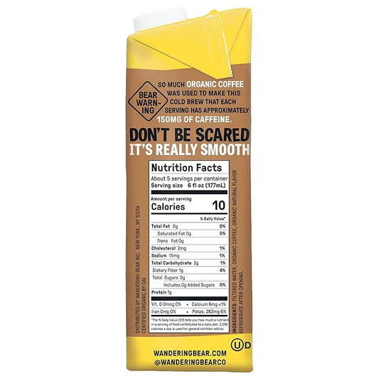 Wandering Bear Organic Vanilla Cold Brew Coffee, 32 fl oz, 6 pack - Extra Strong, Bold, Smooth, Unsweetened, Shelf-Stable, Ready to Drink, Gluten Free, & Vegan, Iced Cold Brewed Coffee Drinks