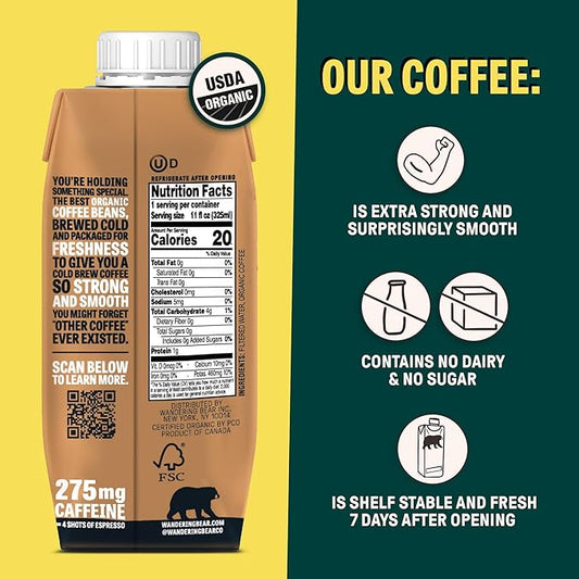 Wandering Bear Straight Black Organic Cold Brew Coffee On-the-Go, 11 fl oz, 12 pack - Extra Strong, Bold, Smooth, Unsweetened, Shelf-Stable, Ready to Drink, 100% Organic Iced Cold Brewed Coffee Drinks