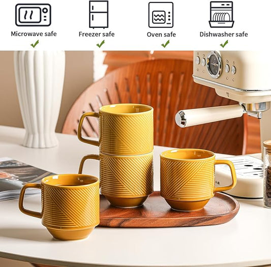 Stackable Coffee Mugs Set: 13 oz Ceramic Stacking Cups for Cappuccino Latte Tea - Microwave Safe Mug for Home & Office - 4 PCS, Mustard Yellow