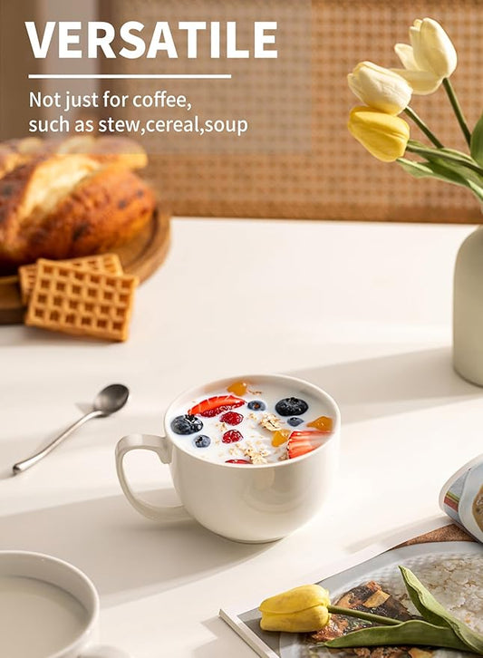 Chulan Large White Bone China Soup Coffee Mugs, 22 oz Lightweight Jumbo Porcelain Mugs Set of 2, Ceramic Extra Big Cups with Handles for Hot Drink Cereal Salads Desserts Coffee Tea Latte Cocoa Juice