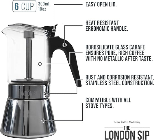 London Sip Glass and Stainless Steel Stovetop Espresso Maker Moka Pot Italian Coffee Percolator, Glass, Medium (10.14 oz)