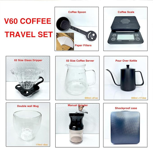 DS&DV Coffee Set Incl. Coffee Scale Glass Driper,Manual Grinter,Pour Over Kettle,Paper Filters,Double Wall Mug for Camping and Travelling (8 in 1 Coffee Makers)