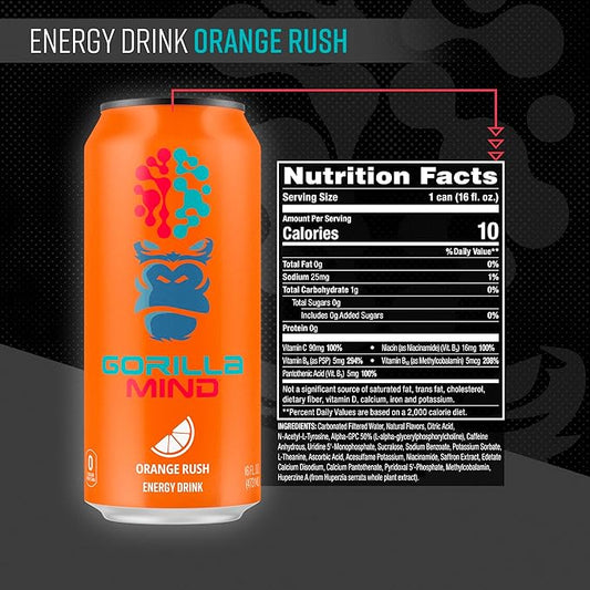 Gorilla Mind Energy Drink | Unmatched Energy · Amplified Focus | N-Acetyl-L-Tyrosine, Alpha-GPC, 200mg Caffeine, Uridine, Saffron | 0 Sugar Or Artificial Colors | 16oz, 12-Pack (Orange Rush)