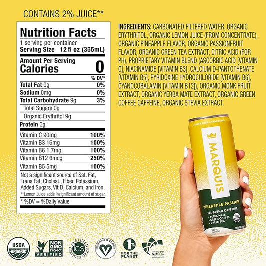 Marquis - Natural Energy Drink - Pineapple Passion - Sugar Free - 0 Calories - 100mg of Organic Plant Based Caffeine - Yerba Mate - Green Tea - Vitamin C & B Vitamins - Vegan - 12 oz Cans - 12 Pack
