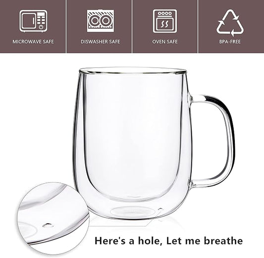 CNGLASS Large Double Wall Glass Coffee Mug 15.2oz,Clear Insulated Glass Espresso Cup with Big Handle,set of 1