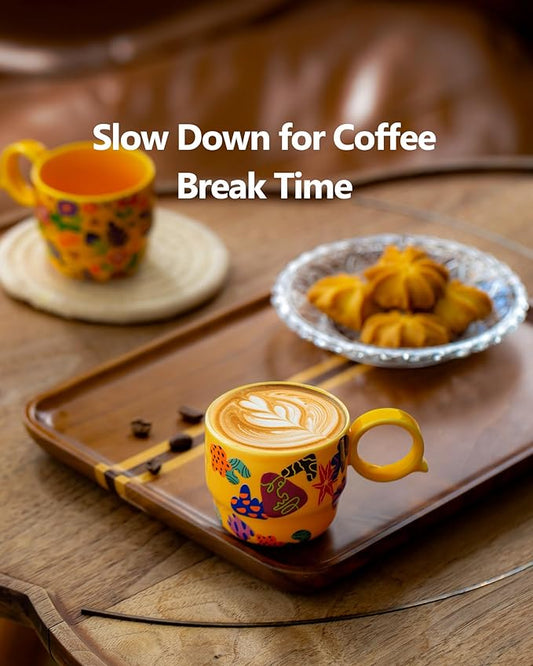 Ceramic Mini Espresso Cups Set of 2 – 3 oz Double Espresso Coffee Cups with Q Handle, Yellolw Floral and fruit Pattern, Small Espresso Shot Cups for Home Coffee Bar,Lungo