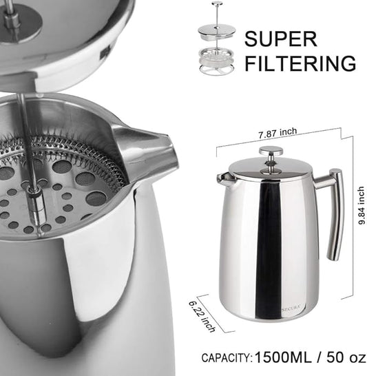 Secura French Press Coffee Maker, 50-Ounce, 304 Stainless Steel Insulated Coffee Press with Extra Screen