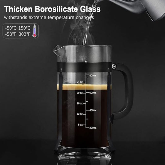 QUQIYSO French Press Coffee Maker 34oz 304 Stainless Steel French Press with 4 Filter, Heat Resistant Durable, Easy to Clean, Borosilicate Glass Coffee Press, 100% BPA Free Glass Teapot, Black