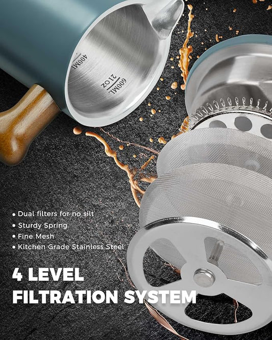 French Press Coffee Maker, French Press 304 Stainless Steel with 4 Filter, Heat Resistant Durable, Easy to Clean, Borosilicate Glass Coffee Press, 100% BPA Free Glass Teapot, 21 ounce, Dark Pewter