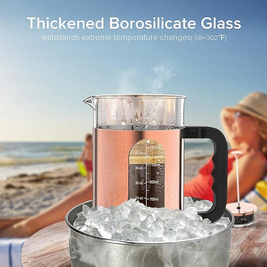 BAYKA 34oz French Press Cold Brew Coffee Maker, Heat and Cold Resistant Thickened Borosilicate Glass Stainless Steel Coffee Press, Iced Coffee Pot Tea Pitcher for Kitchen Travel Camping,1 Liter,Silver