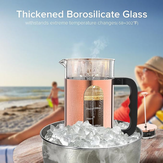 BAYKA 21 Ounce 0.6 Liter French Press Coffee Tea Maker Small, Heat Resistant Thickened Borosilicate Glass Stainless Steel Single Serve Brewer, Cold Brew Percolators, Cafetera Teapot, Copper
