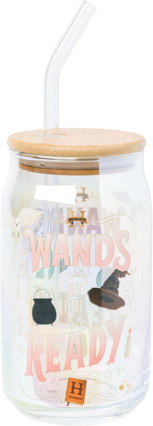 Silver Buffalo Harry Potter Iconic Icons Pattern Wands at the Ready 2 Pack Glass Jar Tumbler with Bamboo Lid and Glass Straw, 16 Ounces