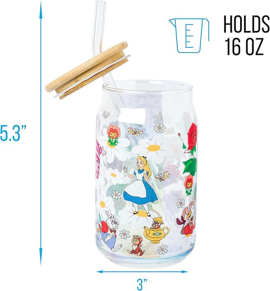 Silver Buffalo Disney Alice in Wonderland Featuring Cheshire Cat, White Rabbit, and Mad Hatter in Wild Flowers Glass Jar Tumbler with Bamboo Lid and Glass Straw, 16 Ounces
