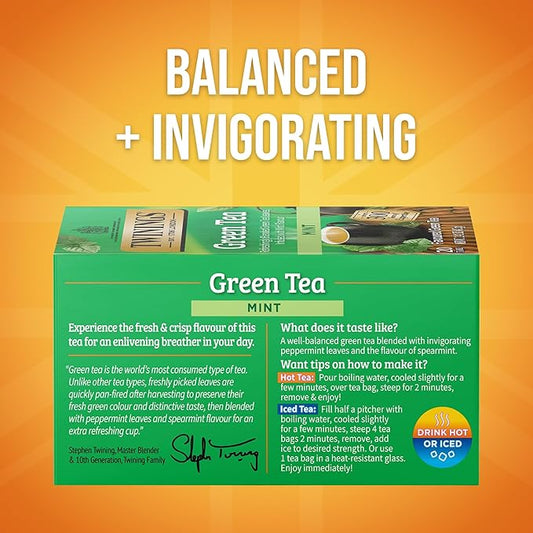 Twinings Green Tea with Mint Individually Wrapped Bags, 20 Count (Pack of 1), Invigorating Aroma, Caffeinated, Enjoy Hot or Iced, 20 Teabags