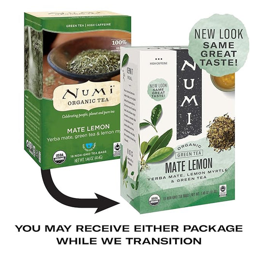 Numi Organic Maté Lemon Tea, 18 Tea Bags, Yerba Mate With Green Tea & Lemon Myrtle, Caffeinated (Packaging May Vary)