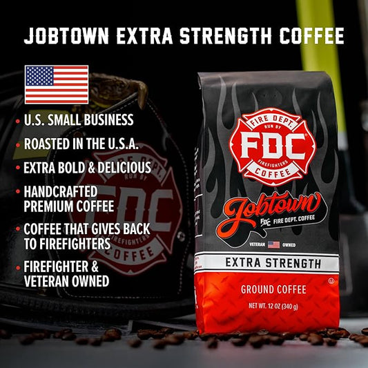 Fire Department Coffee - Gives Back to Firefighters - Jobtown Extra Strength Ground Coffee - Rich & Bold Dark Roast - Roasted in the USA - Veteran Owned - 12 oz