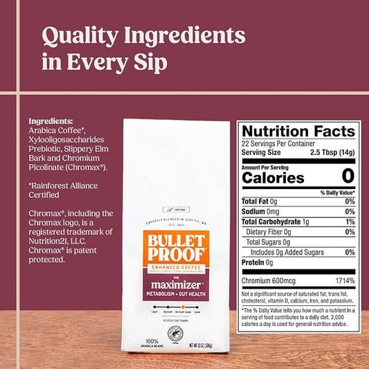 Bulletproof The Maximizer Ground Coffee, 10 Ounces, Clean Coffee with Prebiotics, Metabolism and Gut Health Support, Packaging May Vary