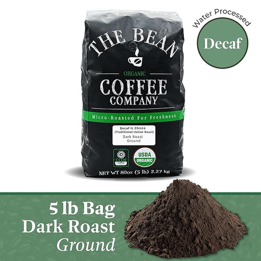 The Bean Organic Coffee Company Water Processed DECAF IL Chicco (Traditional Italian Roast), Dark Roast, Ground Coffee, 5-Pound Bag, Café Molido Tostado Orgánico descafeinado