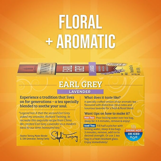 Twinings Earl Grey Lavender Black Tea Individually Wrapped Bags, 20 Count (Pack of 1), Citrus, Bergamot & Floral, Caffeinated, Enjoy Hot or Iced, 20 Teabags