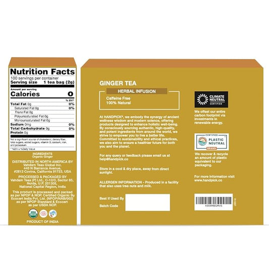 HANDPICK, Organic Ginger Tea Bags (100 Herbal Tea Bags), Authentic Indian Origin, Caffeine Free & 100% Pure Ginger Root |Soothing & Spicy Blend | Round Eco Conscious Teabags
