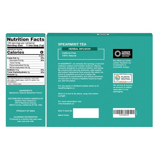 HANDPICK, Spearmint Tea Bags for PCOS relief (100 Herbal Tea Bags) |Refreshing Mint Tea | Non-GMO | Round Eco-Conscious Teabags